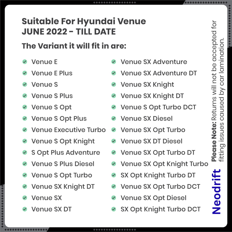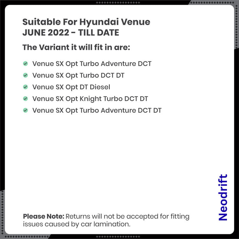 Protect your Hyundai Venue interior with Neodrift's 5D Car Floor Mats, crafted from durable rubber-like material for long-lasting protection. These mats feature a 5D design for a perfect fit and a robust carpet liner for added style and comfort. Built to withstand all weather conditions, they offer superior defence against dirt, spills, and wear while enhancing your car's interior aesthetics. Shop now for the best high-quality automotive floormats designed for your Hyundai Venue!