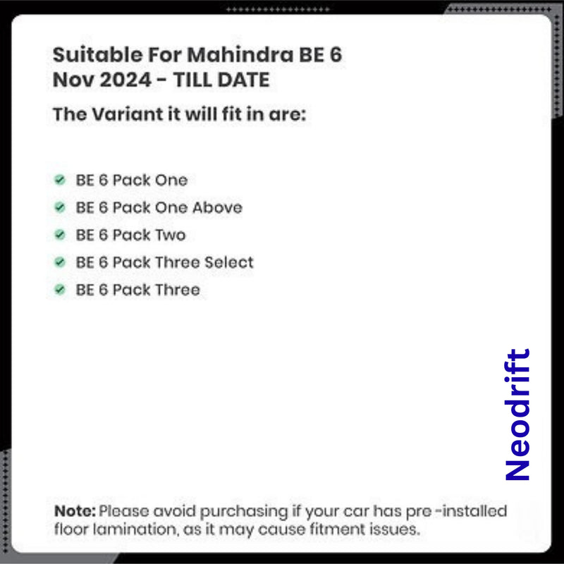 Protect your Mahindra BE 6E interior with Neodrift's 5D Car Floor Mats, crafted from durable rubber-like material for long-lasting protection. These mats feature a 5D design for a perfect fit and a robust carpet liner for added style and comfort. Built to withstand all weather conditions, they offer superior defence against dirt, spills, and wear while enhancing your car's interior aesthetics. Shop now for the best high-quality automotive floormats designed for your Mahindra BE 6E!