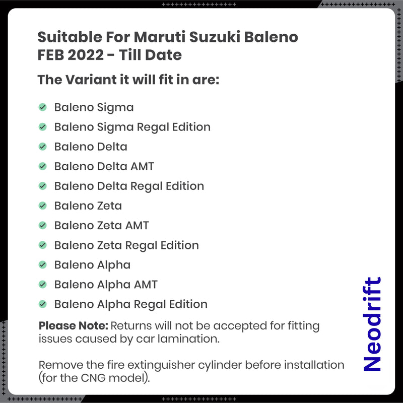 Protect your Maruti Suzuki Baleno interior with Neodrift's 5D Car Floor Mats, crafted from durable rubber-like material for long-lasting protection. These mats feature a 5D design for a perfect fit and a robust carpet liner for added style and comfort. Built to withstand all weather conditions, they offer superior defence against dirt, spills, and wear while enhancing your car's interior aesthetics. Shop now for the best high-quality automotive floormats designed for your Maruti Suzuki Balneo!