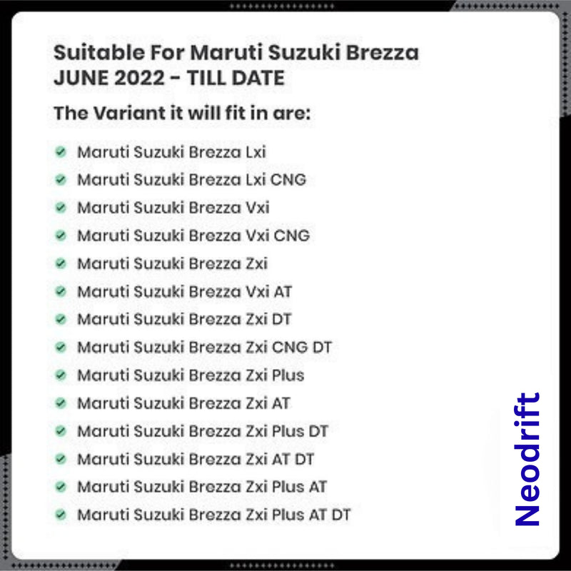 Protect your Maruti Suzuki Brezza interior with Neodrift's 3D Car Floor Mats, crafted from durable rubber-like material for long-lasting protection. These mats feature a 3D design for a perfect fit and a robust carpet liner for added style and comfort. Built to withstand all weather conditions, they offer superior defence against dirt, spills, and wear while enhancing your car's interior aesthetics. Shop now for the best high-quality automotive floormats designed for your Maruti Suzuki Brezza!