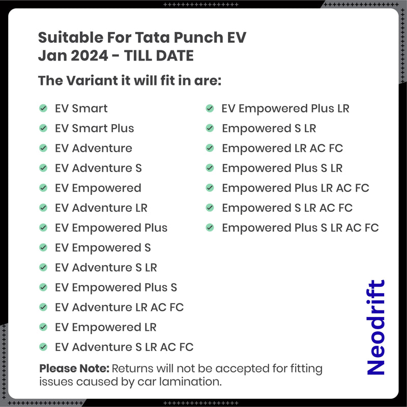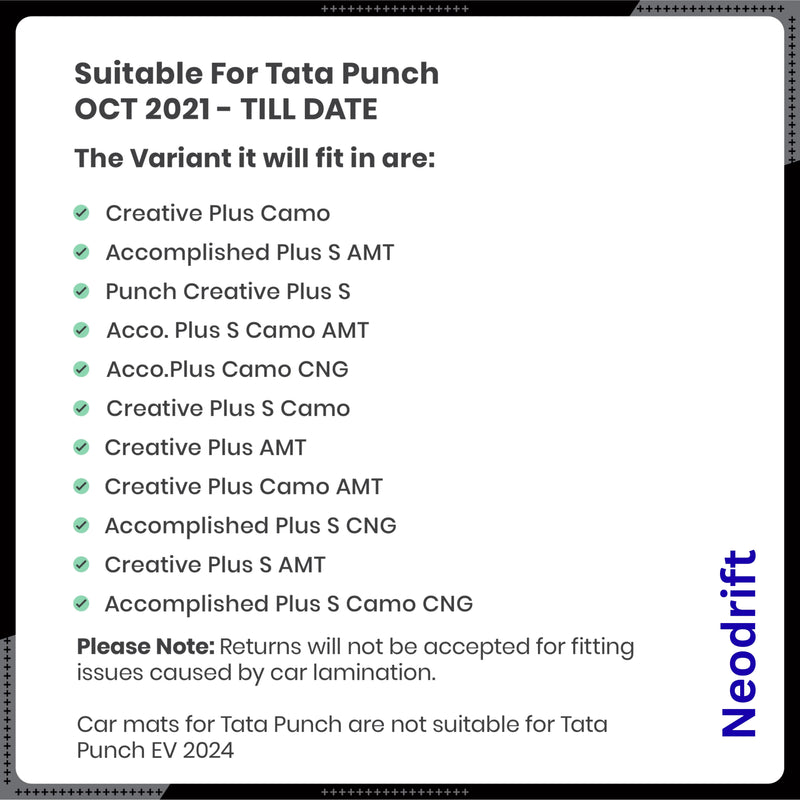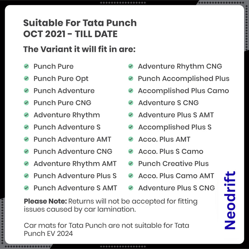 Protect your Tata Punch interior with Neodrift's 5D Car Floor Mats, crafted from durable rubber-like material for long-lasting protection. These mats feature a 5D design for a perfect fit and a robust carpet liner for added style and comfort. Built to withstand all weather conditions, they offer superior defence against dirt, spills, and wear while enhancing your car's interior aesthetics. Shop now for the best high-quality automotive floormats designed for your Tata Punch!